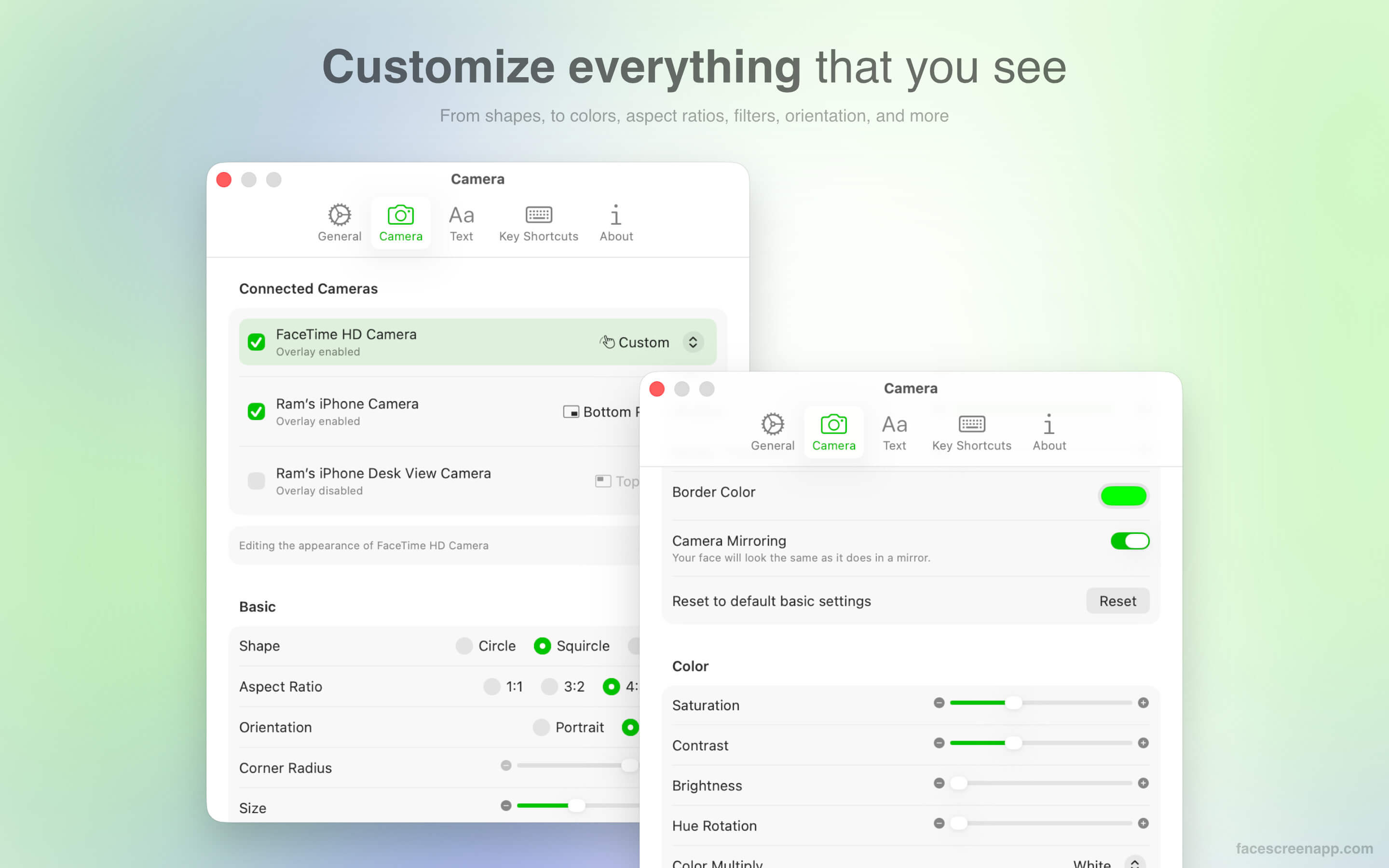 FaceScreen is the only Mac app that lets you show several camera overlays at the same time, for example different angles or a guest beside you. Each overlay is independent: position, shape, styling, and shortcuts can all differ per camera, so one feed can stay minimal while another stays bold.