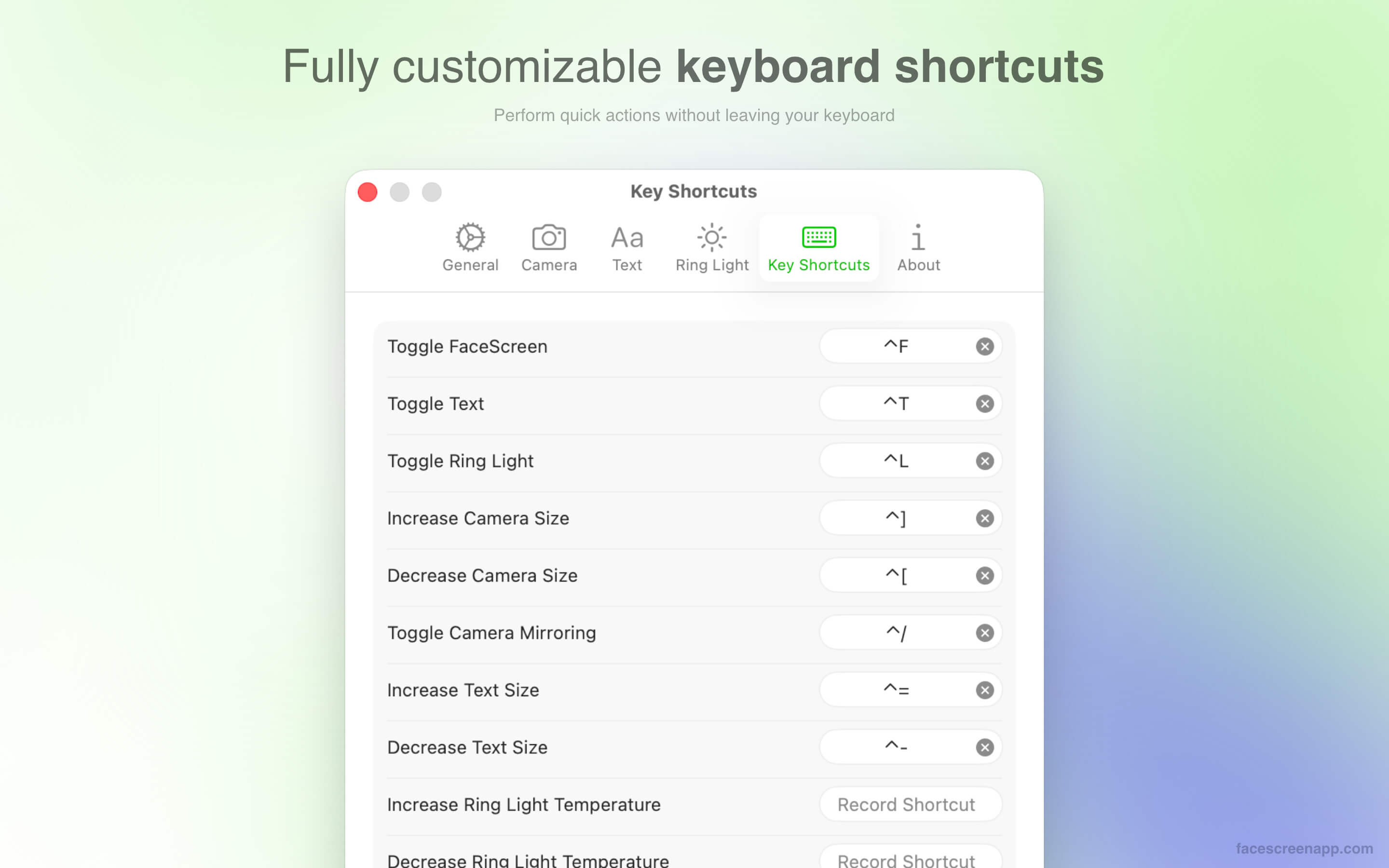 - Global shortcuts: Assign keyboard shortcuts for every Ring Light action, so tweaks stay fast mid-call or mid-recording.
